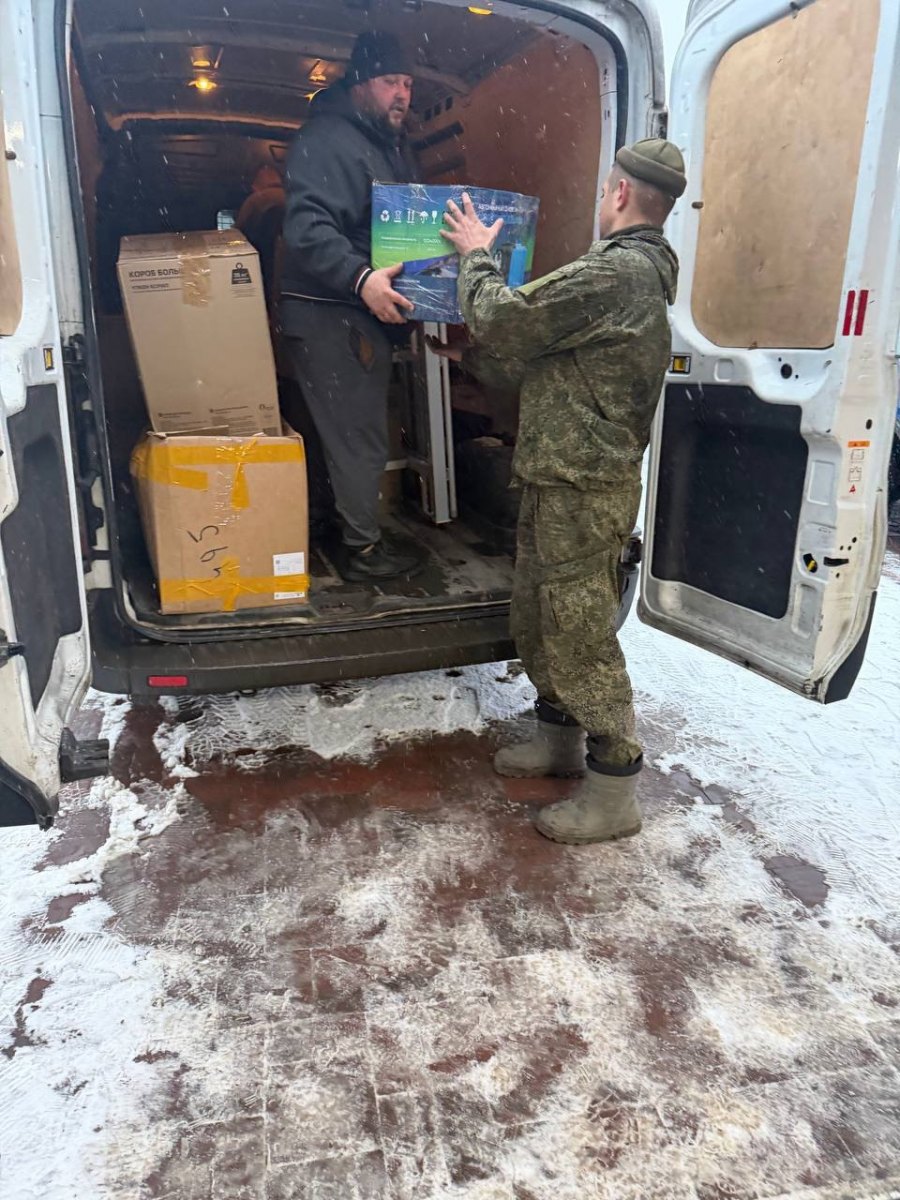Данная поездка была приурочена к приближающимся праздникам – Новому Году и Рождеству Христову. Уже по традиции, приехав в Белгород, мы, прежде всего, разгрузили часть груза на волонтерском складе, под руководством белгородского волонтера Татьяны. Здесь мы выгрузили 57 маскировочных сетей, сплетенных аксиньинскими тружениками. Также для раздачи бойцам оставили генератор, оторители, окопные свечи, продукты, термобелье и многое другое.